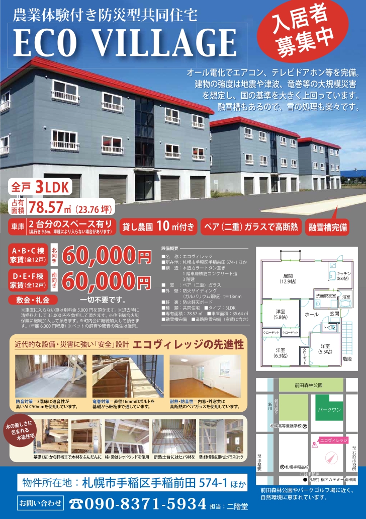 貸し農園付きの防災型共同住宅「エコヴィレッジ」が、このたび入居者を募集しています。